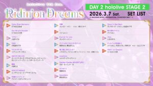 < STAGE2 > ときのそら / さくらみこ / 大空スバル / 大神ミオ / 桃鈴ねね / 獅白ぼたん / ラプラス・ダークネス / アイラニ・イオフィフティーン / クレイジー・オリー / 小鳥遊キアラ / エリザベス・ローズ・ブラッドフレイム / ジジ・ムリン / セシリア・イマーグリーン / ラオーラ・パンテーラ / 白上フブキ (ゲスト) / 白銀ノエル (ゲスト) / 森カリオペ (ゲスト)