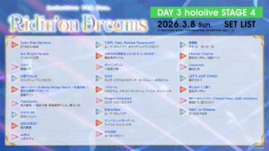 < STAGE4 > ロボ子さん / 星街すいせい / アキ・ローゼンタール / 宝鐘マリン / 常闇トワ / ムーナ・ホシノヴァ / アーニャ・メルフィッサ / カエラ・コヴァルスキア / 森カリオペ / オーロ・クロニー / 古石ビジュ― / ネリッサ・レイヴンクロフト / 音乃瀬奏 / 一条莉々華 / 儒烏風亭らでん / 轟はじめ